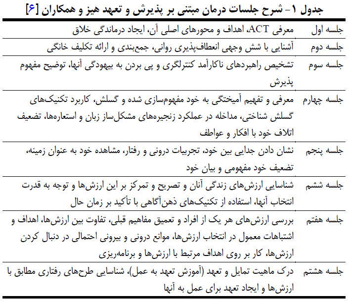 این پژوهش از نوع نیمهآزمایشی با طرح پیشآزمون و پسآزمون با گروه کنترل در انتظار درمان بود. جامعه آماری این پژوهش شامل بیماران مبتلا به سرطان خون مراجعهکننده به بخش پاتولوژی بیمارستان امام خمینی شهر بهشهر در نیمه دوم سال 1402 بود. حجم نمونه بر اساس نمونهگیری هدفمند، 40 نفر بر اساس ملاکهای ورود و خروج انتخاب شدند و به شیوه تصادفی (روش قرعهکشی) به گروهها تخصیص یافتند. ملاکهای ورود شامل تشخیص قطعی سرطان توسط پاتولوژیست، طی شدن حداقل یک سال از بیماری، بودن در مرحله شیمیدرمانی، فقدان وجود اختلالات روانی به تشخیص روانشناس بالینی، رضایت و موافقت شرکتکنندگان بهمنظور شرکت در جلسات درمان و دامنه سنی بین 30 تا ٦٠ سال بود. ملاکهای خروج شامل شرکت در هرگونه مداخله روانشناختی (دستکم از ٦ ماه قبل از ورود به پژوهش)، غیبت بیش از ٢ جلسه در جلسات و عدم رضایت برای ادامه مطالعه بود. برای گروه آزمایش درمان ACT بر اساس طرح درمان هیز و همکاران [6] در 8 جلسه 1.5 ساعته و هفتهای یک جلسه به صورت گروهی انجام شد (جدول 1). در مورد گروه گواه هیچ مداخلهای اعمال نگردید. پس از اتمام این جلسات مرحله همزمان پسآزمون در هر دو گروه به عمل آمد.