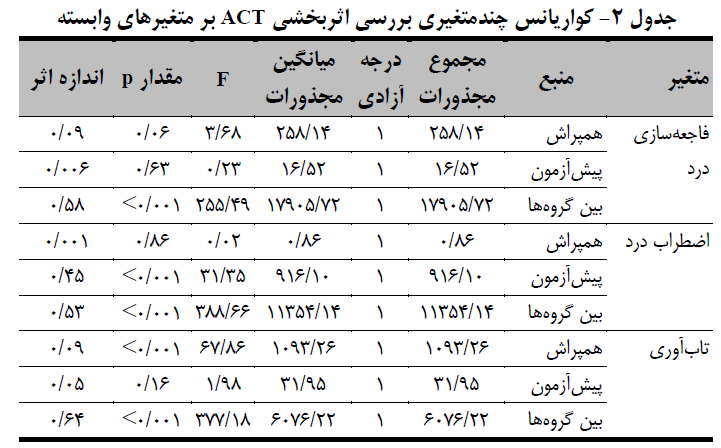 در مورد بررسی اثربخشی ACT بر فاجعه سازی درد و اضطراب درد و تابآوری نتایج تحلیل کوواریانس در جدول 2 نشان دهنده آن است که با کنترل نمرات پیشآزمون، اثر گروه بر نمرات پسآزمون فاجعهسازی درد، اضطراب درد و تابآوری معنادار است. بدین صورت که بعد از اتمام جلسات مداخله، نمرات فاجعهسازی درد و اضطراب درد کاهش معنادار و تابآوری افزایش معنادار در گروه مداخله نسبت به گروه کنترل داشت. اندازه اثر گروه (مداخله) بر فاجعهسازی درد و اضطراب درد و تابآوری به ترتیب 0.58، 0.53 و 0.64 بهدست آمد. بنابراین اثر مداخله توانست به ترتیب 58، 53 و 64% واریانس فاجعهسازی درد و اضطراب درد و تابآوری را تبیین نماید.