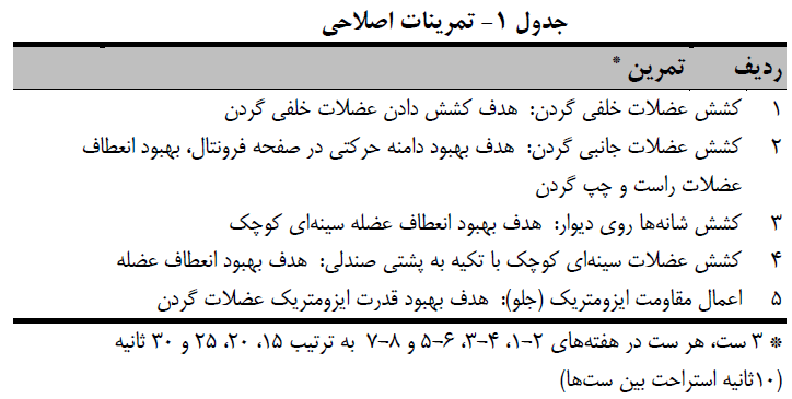 برنامه تمرینی شامل 5 تمرین (کشش عضلات خلفی گردن، کشش عضلات جانبی گردن، کشش شانهها روی دیوار، کشش عضله سینهای کوچک و اعمال مقاومت ایزومتریک سر و دستها). شرکتکنندگان در گروه تمرین در هفته سه بار و به مدت 8 هفته تمرینات را زیر نظر مربی تمرینی دریافت کردند. تمرینات در هر جلسه در سه ست و با شدت پیشرونده از 15 ثانیه به 30 ثانیه با فواصل استراحت 10 ثانیهای بین هر ست انجام شد. در شروع هر جلسه تمرین، برنامه عمومی گرم کردن به مدت 10 دقیقه و در پایان هرجلسه تمرین؛ تمرینات سرد کردن به مدت 10 دقیقه انجام میشد [10]. جزییات برنامه تمرینی در جدول 1 آورده شده است.