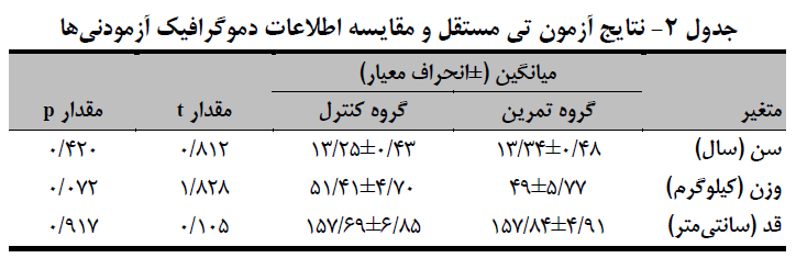 اطلاعات توصیفی و مشخصات دموگرافیک در هر گروه و نتایج آزمون تی مستقل در جدول 2 ارائه شده است. نتایج نشان داد که اطلاعات دموگرافیک در گروهها همسان بوده و تفاوت معناداری بین گروهها در میانگین سن، وزن و قد وجود ندارد.