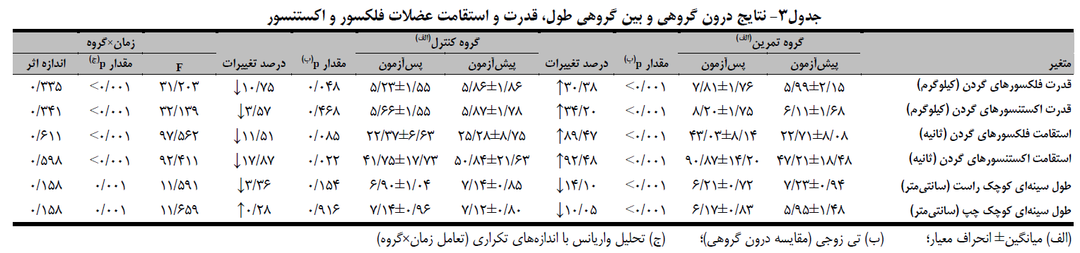 نتایج آزمون تحلیل واریانس با اندازههای تکراری نشان داد که اثر تعاملی زمان در گروه بر میزان استقامت عضلات فلکسور و اکستنسور گردن معنادار است (0.05 ≥p). مقایسههای زوجی نشان داد که میزان استقامت عضلات فلکسور و اکسنتسور گردن در گروه تمرین از پیشآزمون تا پسآزمون افزایش معناداری داشته است (0.05 ≥p). در حالی که میزان استقامت اکستنسورها در گروه کنترل از پیشآزمون تا پسآزمون کاهش یافته است (0.05 ≥p) (جدول 3)